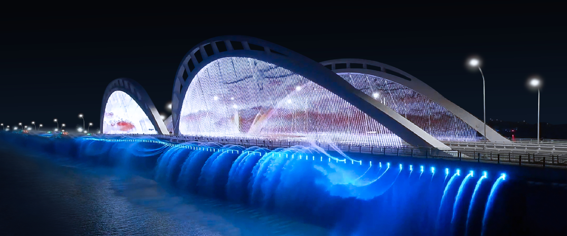 杭州亞運(yùn)會(huì)重點(diǎn)照明工程,聲、光、電協(xié)同嚴(yán)總橋梁水幕燈光秀,營造沉浸式夢(mèng)幻夜景。 迎八方來客,為亞運(yùn)造勢(shì)。